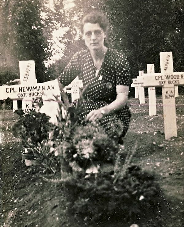 Shortly after the end of the war Joy Newman, who had worked in munitions during the conflict, visited her husband's grave in Brouay War Cemetery still marked by a wooden cross.